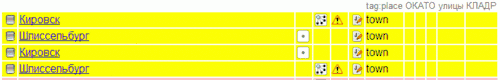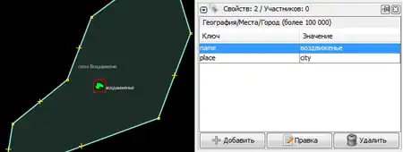 - Разбить контур на несколько, по одному для каждого населённого пункта. Скопировать названия и значения place с точек на соответствующие контуры.