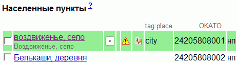 - Определить верное название пункта, поправить теги name и place_name на точке и контуре, чтобы они совпадали. Заодно проверить равенство значений тега place.