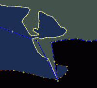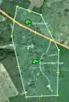 - Сверяясь со спутниковой фотографией, расцепить границы. Возможно, сделать их соприкасающимися (хотя при рисовании на глаз в этом нет практического смысла). Прочитать комментарии на линиях, постараться определить источник границ: возможно, они соприкасаются на практике (граничный знак одного населённого пункта совмещён с граничным знаком другого).
