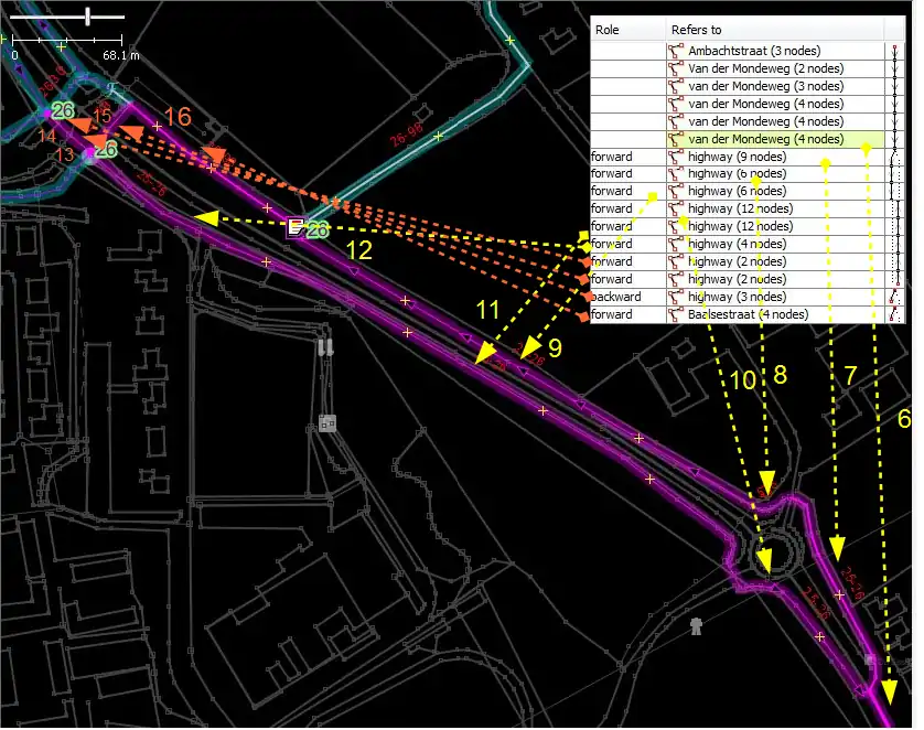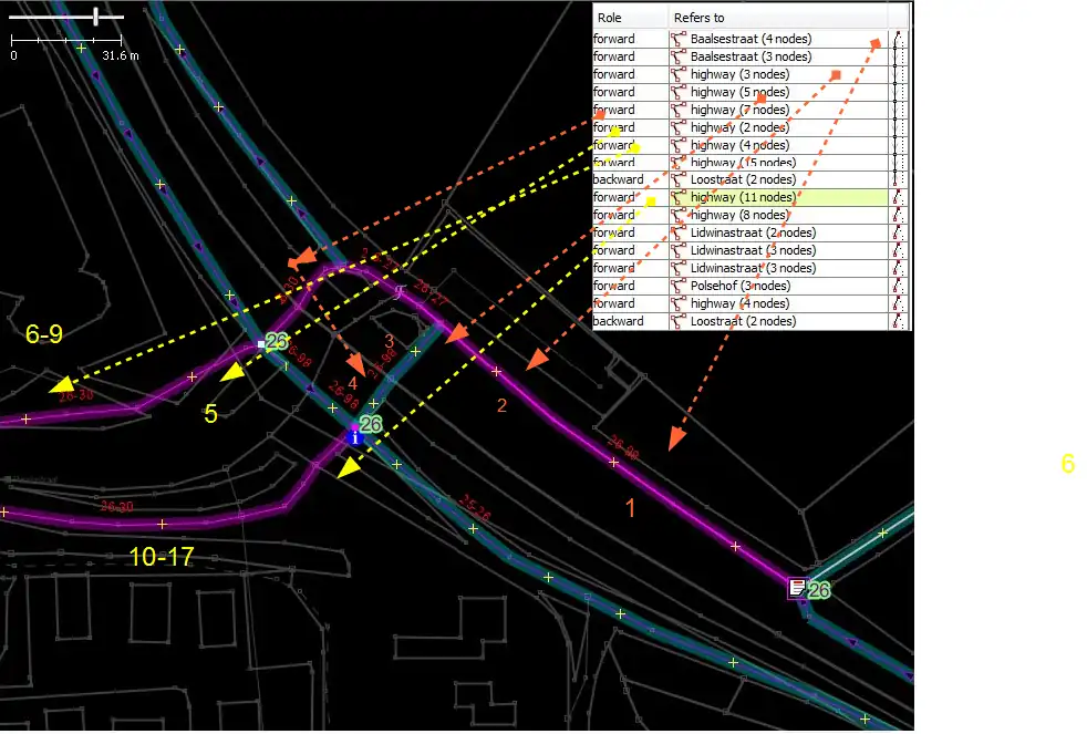 - Все линии, составляющие маршрут между двумя точками соединения, с соответствующими ролями forward/backward, если необходимо (используются разные линии, перехода с xx-yy, чем с yy-xx, нет необходимости добавлять роли на перекрёстках с круговым движением, которые используются для обоих направлений движения). Все эти роли означают, что основная линия следует в направлении его стрелок для этой конкретной ветви маршрута.