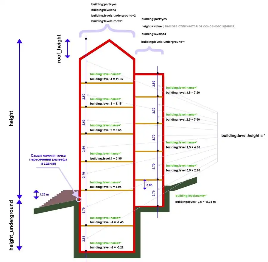 - level:number:<число>=<значение>, например: indoor:level:1=3.95. Значение 3.95 означает 3.95 метра над самой низкой точкой рельефа с точкой пересечения здания.