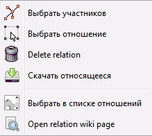 Все пункты этого меню встречались вам в других панелях. Разве что «скачать относящееся» загрузит «родителей» не только всех членов отношения, но и самого отношения. Полезная функция при работе с границами. Точно такое же меню открывается для любого отношения из списка.