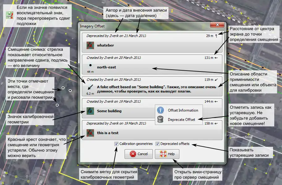Выберите калибровочный объект, затем пункт меню «Сохранить смещение снимка». Тут вам должен предстать выбор между геометрией и смещением (где нужно нажать первую кнопку). Если его нет, убедитесь, что на карте выбран только один объект, и если он загружен из OSM, все его точки входят в загруженную область. В качестве описания геометрии расскажите про калибровочный объект, если с ним могут быть проблемы (например, болотное озеро может сместиться) — упомяните их (но лучше выберите более надёжный объект). Требования к описанию те же: от 3 до 200 символов.