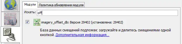 Откройте диалог настроек, вкладку модулей и просмотрите подвкладку "Установленные". Должен открыться список с установленными модулями, где должен быть «imagery_offset_db».