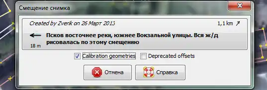 Для загрузки вычисленного смещения на сервер выберите пункт «сохранить смещение снимка». От вас потребуют только описание района, к которому применимо смещение. Внимание: это не название точки, где смещение определялось, а район. Город в примере мал и лежит на равнине, поэтому смещение везде одинаково: