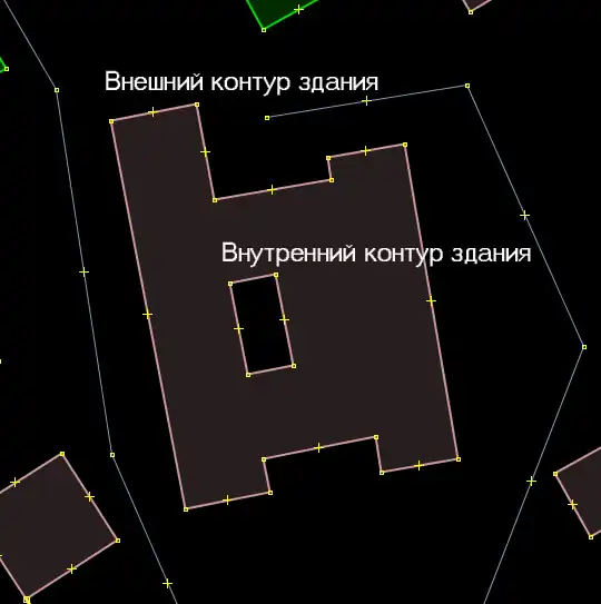 Здания имеющие внутренний двор, отмечаются при помощи отношения мультиполигона.