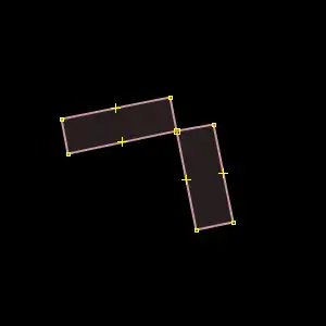 | В JOSM (общая точка имеет бо́льший размер, по сравнению с остальными). | В Potlatch 2 (выделено одно из зданий, общая точка имеет дополнительную обводку). |