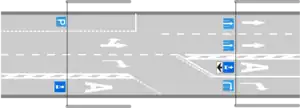 Изменение расположения выделенной полосы на проезжей части (например при отдельной полосе для правого поворота или изменении числа полос) необходимо “разрезать” дорогу в месте перестроения.