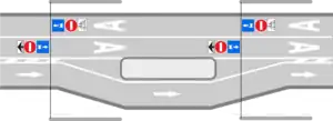 Двухсторонняя 3-полосная проезжая часть с левосторонним расположением попутной выделенной полосы и встречной выделенной полосой. Запрет движения по выделенной полосе такси в оба направления. Разрешено движение велосипедистов во встречном направлении. Остановочные платформы разделяют проезжую часть на две. |