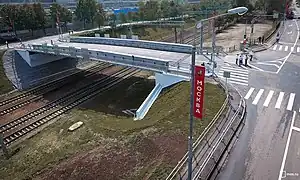 | Дорога, проходящая снизу, имеет рампы, по которым она опускается ниже уровня земли. Пути, проходящие по верху, не имеют уклона. Порталы тоннеля чётко выражены. | Дорога, проходящая снизу, не имеет уклона, и проходит по уровню земли. А вот чтобы проехать по верхней - нужно предварительно подняться на насыпь. Видны устои путепровода. |