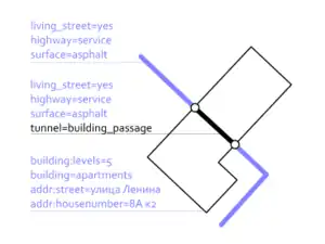 name=*- Название (моста, тоннеля или дороги)layer=*- Пересечение путей в разных уровняхcovered=*- Для дорог накрытых сверхуaccess=*- Ограничения доступаmaxheight=*- Ограничения по высотеmaxwidth=*- Ограничение по ширинеmaxweight=*- Ограничения по весуlit=*- Освещение- Proposed_features/building_passage - Арки в домах, крытые галлереи
