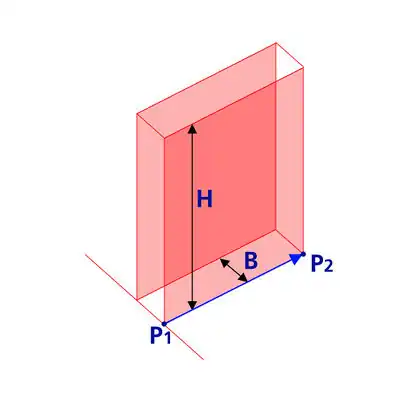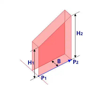 Falls nicht die Polylinie P1-P2, sondern Punkte P1 und P2 mit zwei verschiedenen Höhen height=* ( entsprechend H1 und H2) getaggt werden, so wird die Oberkante der Wand entsprechend dargestellt:
