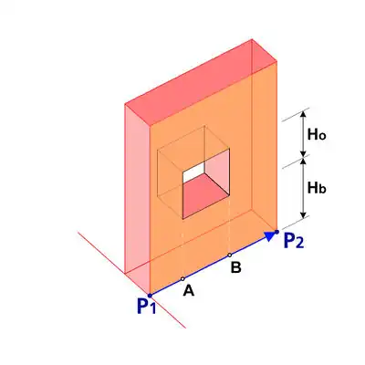 Element sciana moze zawierac elementy Bolean minus. Punkty A i B sa tagowane za pomoca multipolygon:inner , oraz: Ho- wysokosc otworu i Hb - wysokosc od dolnej krawedzi sciany do poczatku otworu.
