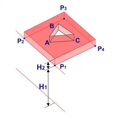Trójwymiarowy otwór jest zapisywany w widoku 2D jako relacja : P1-P2-P3-P4 to multipolygon:outer, A-B-C to multipolygon:inner