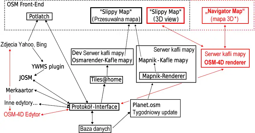 Для реализации концепции требуется создание новых элементов в OSM (фрагменты красным цветом ниже). Ядро программы в настоящее время разрабатывается в Katedrze Informatyki Stosowanej в Лодзи