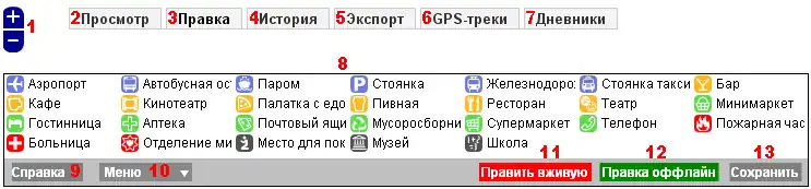 - Правка вживую: ваши изменения будут загружены на сервер автоматически, как только вы сделаете их — в этом случае кнопка «Сохранить» отсутствует. (Этот вариант не рекомендуется к использованию, так как при создании трека, например, из 50-и точек получается история из такого-же количества правок. Найти потом, кто что редактировал — становится проблематично.)