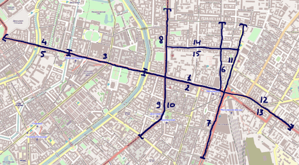 На прошлой сходке куски пирога оказались слишком велики, и это, наверное, оставило у многих чувство незавершённости. В этот раз принцип обхода будет совершенно иным: не вглубь, а вдоль. Каждый возьмёт по одной стороне одной улицы, соберёт POI, заглянет во дворы и пройдётся по примыкающим улицам, если останется время.