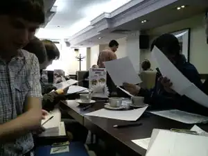 Всё обошли за пару часов, в «Япоше» уже были зарезервированы столики. Подошли все почти одновременно. Сделали общие фото и снимки исписанных листов. Заказали вкусной еды. Пара человек воспользовалась вай-фаем. Рассказывали об интересных местах, провели блиц-опрос «как обозначать».
