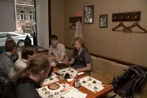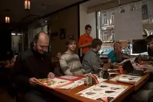 Как водится, распечатал обходные листы и новые визитки — и в кафе, ждать. «Шоколадница» в этот раз отказалась резервировать нам столики, поэтому пришёл заранее и сделал вид, что занимаю все десять мест. К назначенным 11 часа подошли Fortress с девушкой и москвичи — Sim и Dezhin. Странны образом оказалось, что последние приехали специально на картопати. Фи всем местным, которые не смогли из дому выйти на половину дня! Хорошо позавтракали — все, как один, взяли сырники, — познакомились и прочее по плану. К 12 подошли GaM и Diomas, и раз уже пора бы выходить, перешёл к делу и рассказал про новый пирог.