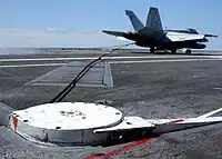 Эта система называется «стопорный механизм» или «тормозной механизм». Типичные системы состоят из нескольких стальных тросов, проложенных через посадочную площадку самолёта и предназначенных для захвата хвостовым крюком самолета. Хотя эти системы наиболее распространены на авианосцах, они иногда используются на наземных военных аэродромах для тренировок, экспедиций или аварийного использования.