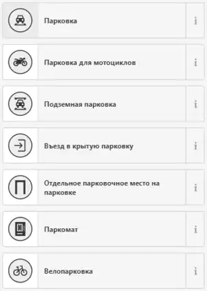 amenity=bicycle_parking— парковка для велосипедовamenity=motorcycle_parking— парковка для мотоцикловamenity=parking_entrance— въезды и выезды на подземные или многоэтажные паркингиlanduse=garages— земля, используемая под большое количество навесов или гаражей для автомобилейamenity=parking_space— отдельное парковочное место (например, парковка для инвалидов) на автостоянкеamenity=fuel— автозаправочная станция (автозаправка, АЗС)building=carport— навес для машины (крытая конструкция, которая обеспечивает ограниченную защиту транспортных средств, в первую очередь автомобилей, от непогоды)highway=rest_area— участок вдоль дороги, где водитель может остановиться и отдохнуть, там расположено много парковокparking=layby— парковка с местом для отдыха, рядом с дорогой; обычно между дорогой и придорожной территорией нет физических разделителей (если есть, рассмотрите возможность использованияhighway=rest_area), место рядом с главной дорогой, часто расположенный в сельской местности, где автомобилисты могут передохнуть по пути к месту назначенияhighway=emergency_bay— аварийный отсек на шоссеhighway=passing_place— место разъезда на очень узкой дорогеamenity=vending_machine+vending=parking_tickets— паркомат (автомат по продаже билетов на парковку)hov=*— обозначает требования к занятости транспортного средства на шоссе (для совместного использования)police=car_pound— штрафстоянка (место, где хранятся автомобили, задержанные полицией)
