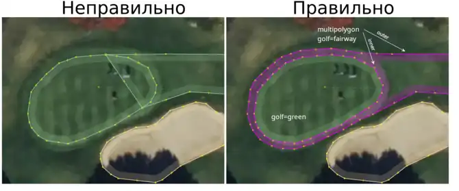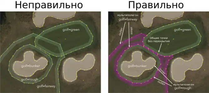 name=*к объектам, например name=bunker, name=fairway 1, name=18th Hole и так далее.name=*следует использовать только в том случае, если объект имеет конкретное индивидуальное имя, а не для общих описаний. Смотрите Names). - Добавление дубликатов линий поверх уже существующих дорог и обозначение их тегом