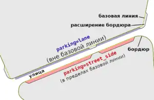 street_side). - Бордюры образуют линию, отделяющую проезжую часть от придорожного пространства. Расширения бордюра и парковка между ними обычно выходят за эту «базовую линию», в то время как парковочные места на улице отстают от этой «базовой линии» (смотрите рисунок справа).