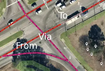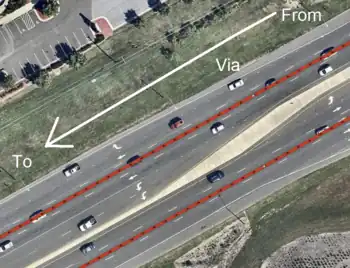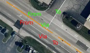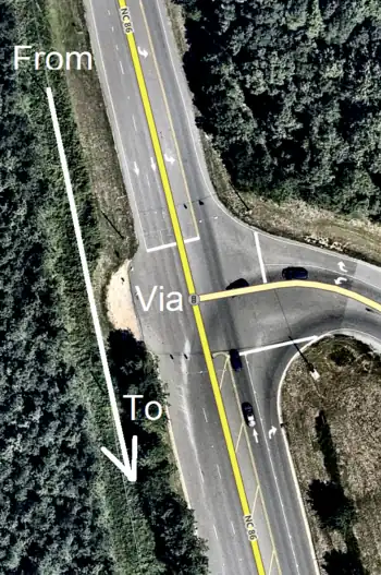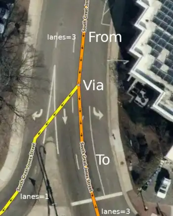 • It should be assumed that no lane changes are possible at the intersection that the relation is located. For example, if the from way and to way both have 2 lanes and no change allowed, it should not be assumed that you can jump from the left lane to the right lane at the via node / way(s).