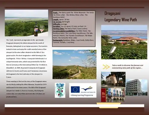 - Descriere traseu:Traseul turistic ales se doreşte o incursiune în pitorescul Podgoriei Drăgăşani, cea mai veche podgorie din sudul României, datând de pe vremea geto-dacilor. Turistul este invitat pe acest traseu să savureze vinurile podgoriei, medaliate naţional şi internaţional direct din cramele situate pe dealurile de la marginea oraşului Drăgăşani şi să-şi aprindă imaginaţia după ce ascultă legendele locului. Prince Ştirbey, este vinul românesc unic în lume de „crâmpoşie selecţionată”, prezentat în premieră în Germania la Târgul internaţional de vinuri ProWein, care a avut loc la Düsseldorf între 29 februarie şi 2 martie 2004. În prezent, Crâmpoşia de Drăgăşani se vinde bine în Austria şi în Franţa iar Tămâioasa românească de Drăgăşani este cel mai bine vîndut vin al podgoriei în Franţa.