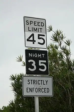 Indicator aratand diferite valori ale vitezei limita in timpul zilei si a noptii. Poza de pe Wikimedia Commons, luata de Daniel Schwen, licentiata cc-by-sa 3.0 |