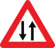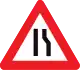 Road narrows (about 150m after the sign) | Sometimes traffic_calming=chicane or traffic_calming=choker on part of the way (this sign can be used for other kinds of narrowing than traffic calming)