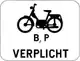 Mandatory cycleway (cyclists and mofas must use it. Pedestrians are allowed to use it if there is no sidewalk or verge. Mopeds are allowed to use it where speed limit is below 50 km/h. Mopeds must use it where speed limit is above 50 km/h. Speed pedelecs follow the same rules as mopeds. Other road users cannot use it) |
