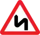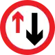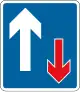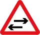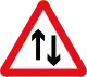 Two-way traffic on route crossing ahead | The associated plate legend may be a distance | |