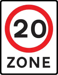 20 zones tend to be residential areas with traffic calming measures, with a 20 mph maximum speed throughout the zone. At the exits from the zones there is a different sign which indicates both the end of the 20 mph limit and what the new speed limit is beyond the zone. Unlike ordinary 20mph limits, 20 zones are intended to be self-enforcing by the traffic calming system. Note: The similar looking "Twenty's Plenty" signs (with a green, not red, circle) are not legal limits and should be signed with |