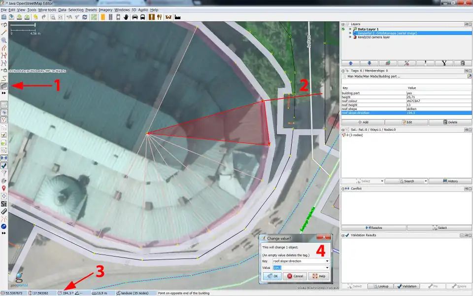 roof:direction=*angle can be found at the bottom of JOSM as marked by note 3 in the figure below.- For square or rectangular roofs, you can note the angle as you draw your line down the roof.
