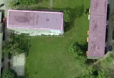 On the buildings on aerial photographs from low altitude (usually higher resolution) perspective distortion is often seen. This means that the correctly-drawn outline of the roof is larger than the building outline.
