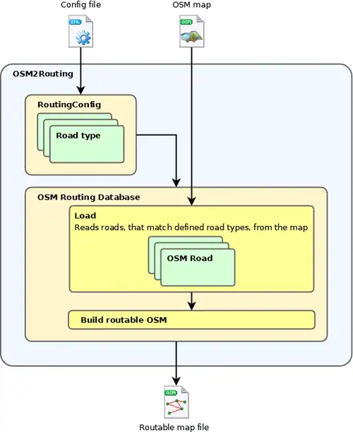 Ways, that don't match accepted road types, relations and unused nodes are discarded. Values of oneway and maxspeed tags from the OSM file take precedence over default values from the config file.