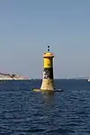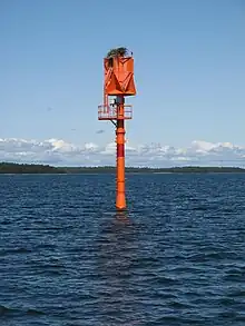 A safe water beacon is a prominent specially constructed object forming a conspicuous mark as a fixed aid to navigation or for use in hydrographic surveys. | ||