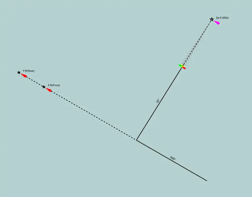 Navigation lines and recommended tracks are mapped as ways (usually just two nodes) laying along the path where the objects are to be displayed. The way should carry the tags for correct rendering. Nodes belonging to other objects, such as leading lights, may be used. The following illustration shows two navigation lines and two recommended tracks. The latter carry seamark:recommended_track:orientation=... tags in order for the bearing to be displayed. The values are decimal numbers, representing the bearing in degrees true.