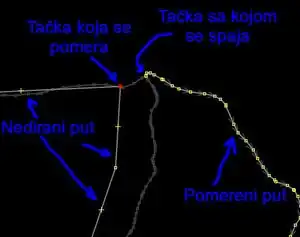 Now way is moved from old (OSM) location to new (cadastre) location and all nodes are modified/added to new locations. From 2 ways we have only 1. What is not fixed now are those end nodes circled with blue.They are now unglued from other OSM boundaries and we need to reconnect them. To do that, you should move existing OSM way (which is not touched earlier) by dragging it to new ways and holding Ctrl to glue it. If nodes are already close, select them holding left click and move them or press "m" (merge of nodes). If we look at previous example, we should do something like in picture: Whole point is to bring back connection. And since we move all locations to where cadastre boundaries are, we take new connection as proper one, and drag node of untouched ways to merged ways and connect them there.