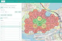 A region on the map (called project) can be divided into sub-regions (called tasks) which can be assigned to a user. This assigned user can then work on a task and specify how far the task is done. This is done via process points: E.g. settings 4 of 10 possible process points says "this task is about 40% done" but it could also mean specific things like "4 of the 10 stores in this task have been surveyed".