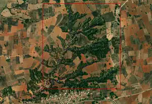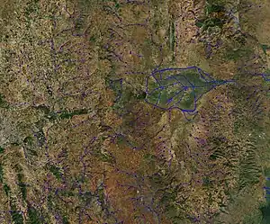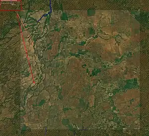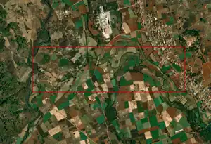 These waterways flow through agricultural fields and are marked by vegetation along the banks.