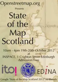 The State of the Map Scotland 2012 Unconference (SOTMS) was held in Edinburgh on Friday 19th and Saturday 20th October 2012 10am-4pm on both days. It was a free event, where everyone was welcome. It was held at [ Inspace] [ (Location)] which is the building next to the Informatics Forum of Edinburgh University. The primary focus of our conference was to get Openstreetmap.org volunteers to meet and discuss what they have done over the past year and for those new to OpenStreetMap to meet us. We also would like to use this opportunity to meet with academic, government or private business groups that are using OSM or freely available data to show us what they are working on. Each day the time slots were split into two sections. The between 10am and 1pm the half hour sessions are dedicated to the unconference for Openstreetmap volunteers from 2pm to 4pm half hour time slots can be booked by organisations that prefer to have more structure in their conference. The time slots will be shown on this page.