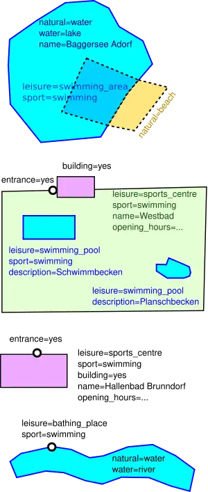 In general we have the water area of a swimming pool and the facility itself. The facility can be swimming or bathing oriented. A Way is drawn around the perimeter (including meadow, playgrounds, buildings, and if you want to also parking areas).