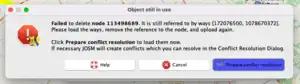 Because we only downloaded boundary=administrative ways and relations via Overpass, we can safely always resolve conflicts to 'their' version. These are usually nodes that have been glued to the admin boundary, and by clicking Resolve to their version, you allow those nodes to persist wherever they were glued.