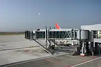 | An enclosed, movable connector that extends from an airport terminal to an airplane |