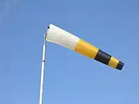windsock shows wind direction and speed. Commonly found at airports; sometimes also found at factories, harbours, farms, and next to highways.