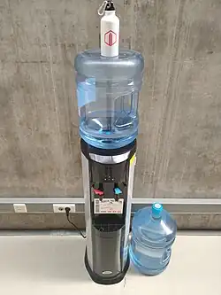 A water dispenser, sometimes referred to as a water cooler, generally indoors.