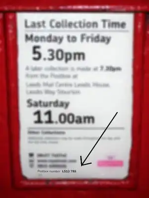 The "box number" assigned to each post box by Royal Mail (to be stored in the ref=* key) can usually be found in the bottom left-hand corner of the plate that shows the box's collection times (see image below). The current style of reference numbers in use comprises the first half of a postcode (known as the postal district) followed by a 1-4 digit number. For example: "AB12 123". Starting in September 2014, some box numbers have a "D" appended to them. For example: "AB12 123D" It is believed that this indicates that this box is operating the new "Collection on Delivery" arrangements (see [1]) and will likely have collection times of 09:00 Monday to Friday and 07:00 on Saturdays. The previous style of box numbers (still visible on some boxes) was to use a one or two letter code followed by a three-digit number, and possibly with an additional location description afterwards. For example "TWT 386 Northway PO". These numbers have now been superseded by a new-style number, even if it's not shown on the box. Old-style numbers are often stored in the old_ref=* key.