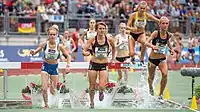 Steeplechase is an obstacle race in athletics, which derives its name from the steeplechase in horse racing.